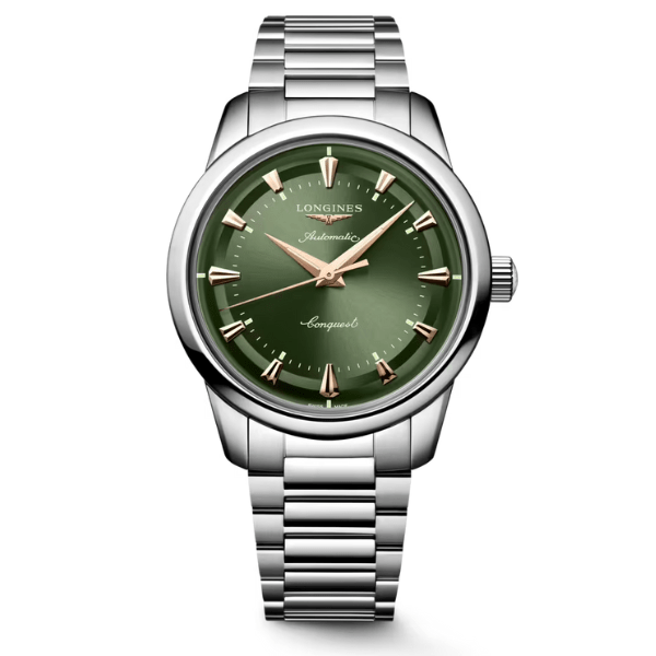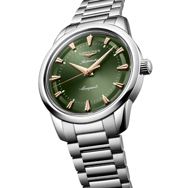 Flip it over and you’ll find a nice little surprise: an 18k gold medallion with a fish motif set into the caseback — a signature detail that’s pure Conquest heritage. Finished with a stainless steel bracelet, a scratch-resistant sapphire crystal, and 5-bar water resistance, this is a watch made to last — in both style and build.
