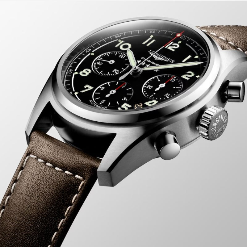For nearly a century, Longines has accompanied some of the world’s greatest explorers in their conquest of the air, sea and land. The Longines Spirit collection brings to life the pioneering spirit that drove these extraordinary men and women to surpass themselves, pursue new ambitions and believe in the impossible. Linking history with innovation, the Longines Spirit Chronograph watches take traditional features from aviators’ watches and combine them with state-of-the-art horological technologies. All their movements are equipped with silicon balance-springs and are chronometer-certified by the COSC. The Spirit Chronograph sits on a Brown Leather Strap and is rated for 100M water resistance. The Chronograph boasts a 66-hour power reserve.
