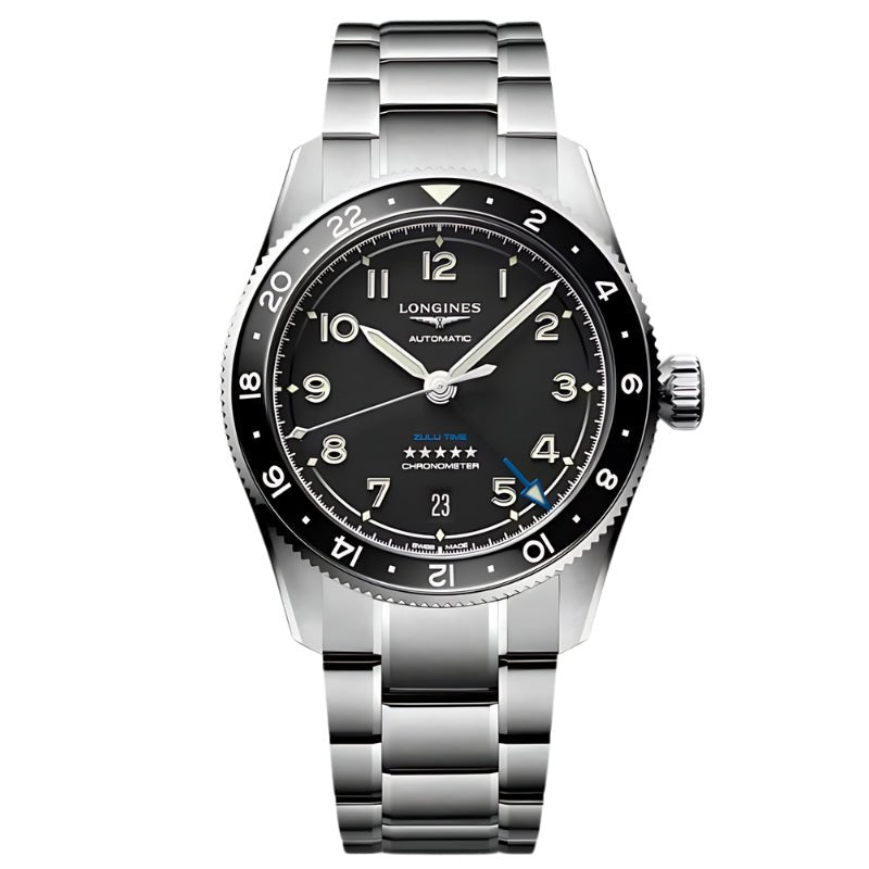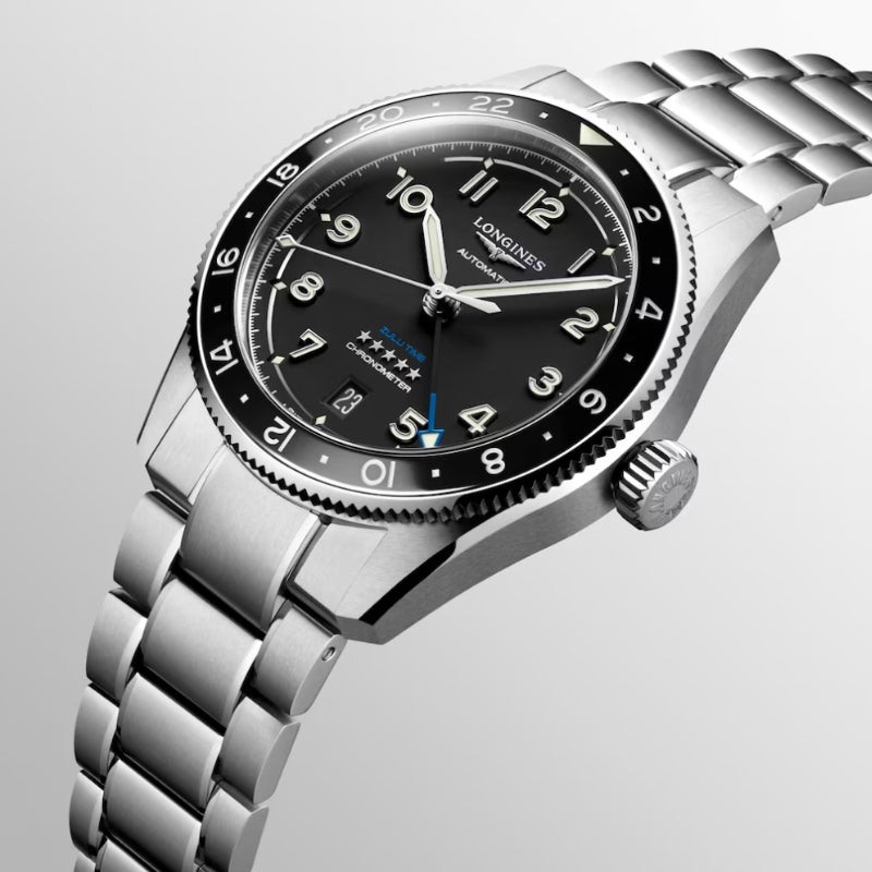 Historically, Longines has accompanied legendary pioneers as they conquer air, land and sea. Today, the winged hourglass brand has drawn inspiration from this heritage to create Longines Spirit, a collection with an impeccable pedigree. This 39mm stainless steel piece holds a black dial surrounded by a matching black bezel. The Zulu Time sits on a stainless steel bracelet and is rated for 100M water resistance. The GMT makes use of a 24-hour bezel to keep track of multiple timezones.