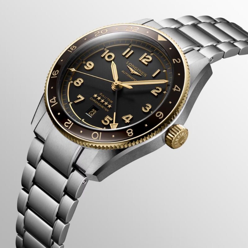 Historically, Longines has accompanied legendary pioneers as they conquer air, land and sea. Today, the winged hourglass brand has drawn inspiration from this heritage to create Longines Spirit, a collection with an impeccable pedigree. This 39mm stainless steel piece holds a black dial surrounded by a matching black bezel. The Zulu Time sits on a stainless steel and is rated for 100M water resistance. The GMT makes use of a 24-hour bezel to keep track of multiple timezones. The Two Tone piece is made with Stainless Steel and Yellow Gold.